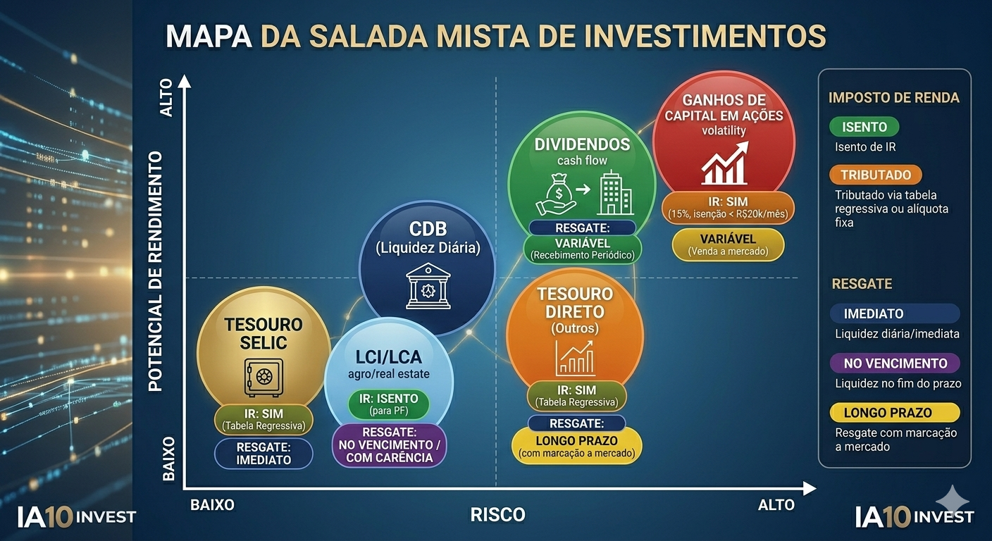 Essa "salada mista" é, na verdade, um buffet de opções. Para montar seu prato (sua carteira de investimentos) de forma equilibrada, você deve escolher as opções que se encaixam nos seus objetivos: